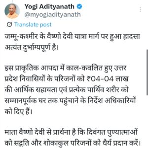 जम्मू प्रशासन ने शवों को जल्द उत्तर प्रदेश भेजने का आश्वासन दिया है। मुख्यमंत्री योगी आदित्यनाथ ने इस दुखद घटना पर संवेदना व्यक्त करते हुए मुआवजे की घोषणा की है, जिससे पीड़ित परिवारों को थोड़ी राहत मिल सके।