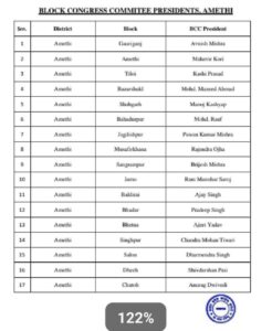 जारी हुई लिस्ट के मुताबिक अवनीश मिश्रा गौरीगंज, महावीर कोरी अमेठी, काशी प्रसाद तिलोई, मोहम्मद मजीद अहमद बाजार शुकुल, मनोज कश्यप शाहगढ़, मोहम्मद रऊफ बहादुरपुर, पवन कुमार मिश्रा जगदीशपुर, राजेन्द्र ओझा मुसाफिरखाना, बृजेश मिश्रा संग्रामपुर, राम मनोहर सरोज जामो, अजय सिंह बल्दीराय प्रदीप सिंह भादर, अजीत यादव भेटुआ, चंद्रमोहन तिवारी सिंहपुर, धर्मेंद्र सिंह सलोन तथा शिवदर्शन पासी को डीह और अनुराग द्विवेदी को छतोह ब्लॉक के अध्यक्ष की जिम्मेदारी दी गई है।