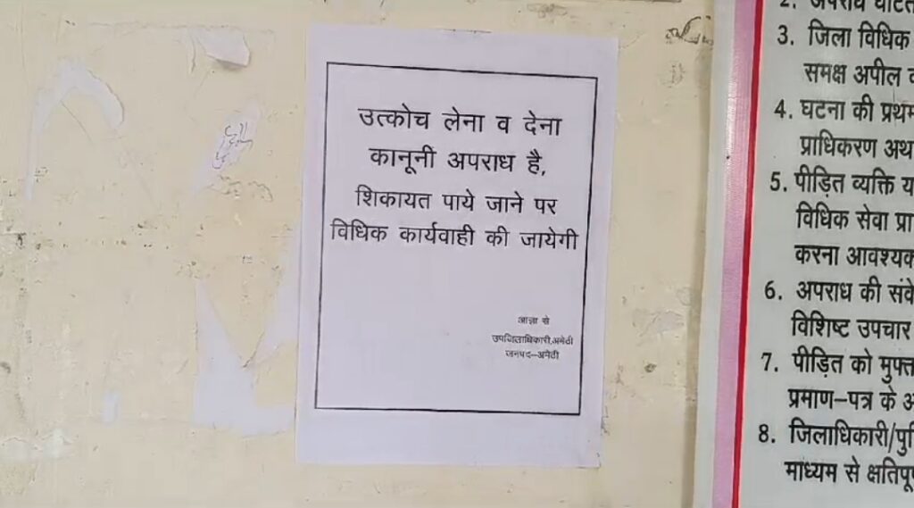 उत्तर प्रदेश के अमेठी क्षेत्र में लगातार घूसखोरी की शिकायतें मिलने के बाद एसडीएम आशीष सिंह ने कड़ा कदम उठाते हुए सभी सरकारी कार्यालयों के बाहर चेतावनी पोस्टर लगवाए हैं। इन पोस्टरों पर लिखा गया है:
