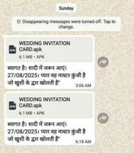 बताया गया कि इस साइबर जालसाजी का शिकार अमेठी जिले के जगदीशपुर के थाना प्रभारी और कांस्टेबल संजय व जसपाल हुए हैं। हैकर्स ने उनके व्हाट्सऐप पर एक APK फाइल भेजी। जैसे ही पुलिसकर्मियों ने इसे खोला, उनका फोन पूरी तरह हैक हो गया और उनके बैंक खातों से रुपये गायब हो गए। हैकर्स ने जो शादी का डिजिटल कार्ड भेजा उसमें एक कोड के साथ संदेश लिखा था “स्वागत है… शादी में जरूर आएं। प्यार वह मास्टर कुंजी है जो खुशी के द्वार खोलती है।” लिंक पर क्लिक करते ही मोबाइल का पूरा डेटा हैक हो गया। एएसपी शैलेंद्र कुमार सिंह ने पुष्टि की है कि थाना प्रभारी और दोनों कांस्टेबल ने साइबर सेल में शिकायत दर्ज कराई है और मामले की जांच शुरू कर दी गई है।