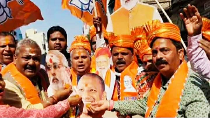 जीत मिलने तक इस दौरान, ढोल-नगाड़ों की थाप पर लोग थिरकते रहे और एक दूसरे को मिठाई खिलाकर जश्न मनाया। भाजपा के चुनाव चिन्ह और पीएम नरेंद्र मोदी का कटआउट पकड़े हुए बीजेपी समर्थक एक दूसरे को भगवा गुलाल लगा रहे थे।