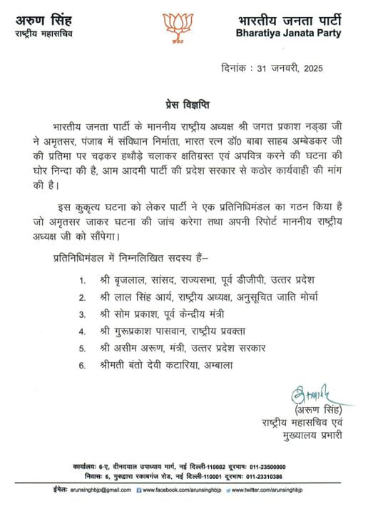 भाजपा के राष्ट्रीय महासचिव अरुण कुमार सिंह ने बताया है कि पंजाब के अमृतसर में संविधान निर्माता, भारत रत्न डॉ० बाबा साहब अम्बेडकर की प्रतिमा पर चढ़कर हथौड़े चलाकर क्षतिग्रस्त किया गया है। भारतीय जनता पार्टी के राष्ट्रीय अध्यक्ष जेपी नड्डा ने इस घटना की घोर निन्दा की है। उन्होंने इस प्रकरण में पंजाब की आम आदमी पार्टी की सरकार से कठोर कार्रवाई की मांग की है।