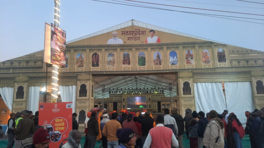 मध्य प्रदेश का पवेलियन इस बार जनजातीय भगोरिया नृत्य की आकर्षक प्रस्तुतियों से मंत्रमुग्ध कर रहा है। यह नृत्य आदिवासी समुदायों की होली से पूर्व मनाए जाने वाले भगोरिया उत्सव का हिस्सा है, जिसमें रंग-बिरंगे परिधान, ढोल-मजीरे की गूंज और युवा गुलाल से खेलते हुए नृत्य करते दिखते हैं। हर शाम छह बजे से रात्रि दस बजे तक लोक नृत्य और संगीत की प्रस्तुतियों से श्रद्धालुओं का मनोरंजन किया जाता है। इसी मंडप में लगाई गई वैदिक घड़ी श्रद्धालुओं के आकर्षण का केंद्र बन गई है। यह दुनिया की पहली घड़ी है। इस वैदिक घड़ी का अनावरण प्रधानमंत्री नरेंद्र मोदी ने गत वर्ष 29 फरवरी को उज्जैन में किया था। इसे पंडाल के बाहर ही स्थापित किया गया है।