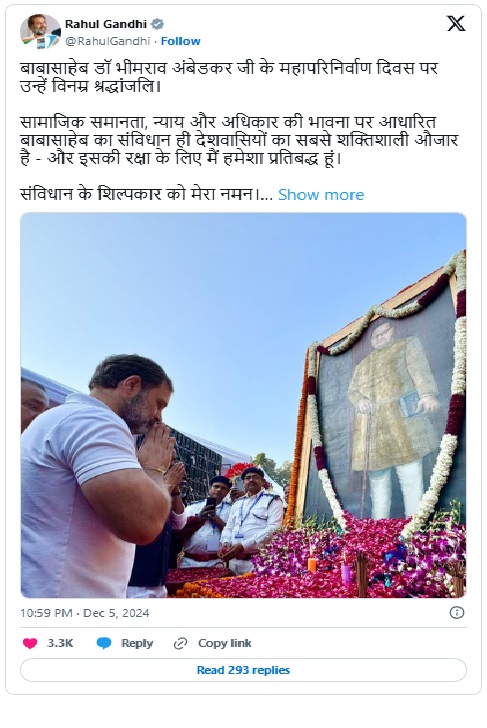 “बाबा साहेब डॉ. भीमराव अंबेडकर को उनके महापरिनिर्वाण दिवस पर विनम्र श्रद्धांजलि। सामाजिक समानता, न्याय और अधिकारों की भावना पर आधारित बाबा साहेब का संविधान देशवासियों के लिए सबसे शक्तिशाली उपकरण है – और मैं इसकी रक्षा के लिए हमेशा प्रतिबद्ध हूं। मेरा सलाम संविधान के निर्माता, जय भीम, जय संविधान!” गांधी ने एक्स पर पोस्ट किया।