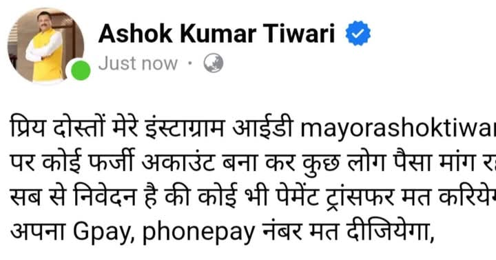 उत्तर प्रदेश में वाराणसी के महापौर अशोक तिवारी के नाम से साइबर ठगी कर लोगों से पैसा ऐंठने का मामला प्रकाश में आया है। एक साइबर अपराधी ने उनके नाम और तस्वीर का उपयोग करके इंस्टाग्राम पर फर्जी आईडी बनाई और लोगों को मैसेज भेजकर पैसे मांगने लगा। महापौर ने अपने फेसबुक पेज पर पोस्ट के माध्यम से इस घटना की जानकारी दी और लोगों से अपील की कि उनके नाम से पैसे मांगने वाले किसी भी मैसेज पर विश्वास न करें।