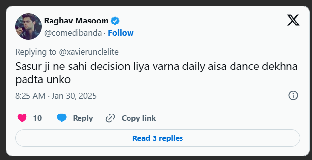 एक यूजर ने कमेंट किया, ‘ससुर जी ने सही फैसला लिया, वरना उन्हें ये डांस रोज देखना पड़ता।’ एक अन्य ने लिखा, “यह कोई अरेंज मैरिज नहीं थी, यह एक एलिमिनेशन राउंड था।”