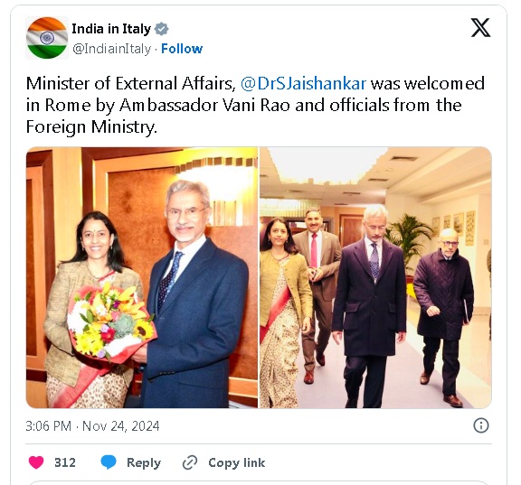 विदेश मंत्री (ईएएम) एस जयशंकर का रोम में इटली में भारत की राजदूत वाणी राव और विदेश मंत्रालय के अन्य अधिकारियों ने स्वागत किया। जयशंकर 24 से 26 नवंबर तक इटली की आधिकारिक यात्रा पर हैं। इटली में भारतीय दूतावास ने एक्स पर एक पोस्ट में कहा, “विदेश मंत्री एस जयशंकर का रोम में राजदूत वाणी राव और विदेश मंत्रालय के अधिकारियों ने स्वागत किया।”