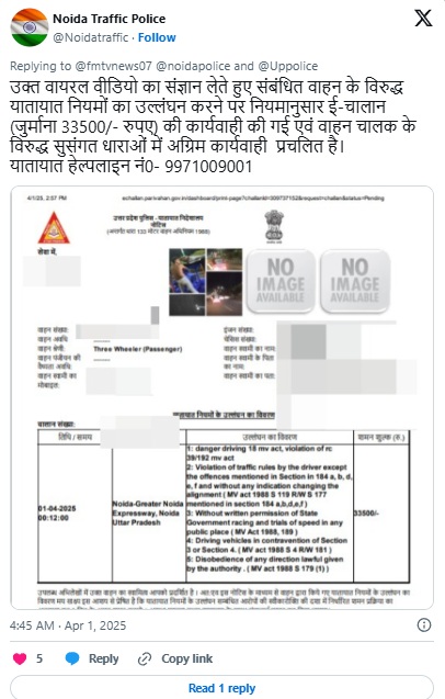 नोएडा ट्रैफिक पुलिस ने एक्स पर कहा, “वायरल वीडियो का संज्ञान लेते हुए, यातायात नियमों का उल्लंघन करने के लिए संबंधित वाहन को ई-चालान (33,500 रुपये का जुर्माना) जारी किया गया। चालक के खिलाफ संबंधित धाराओं के तहत आगे की कार्रवाई चल रही है।”