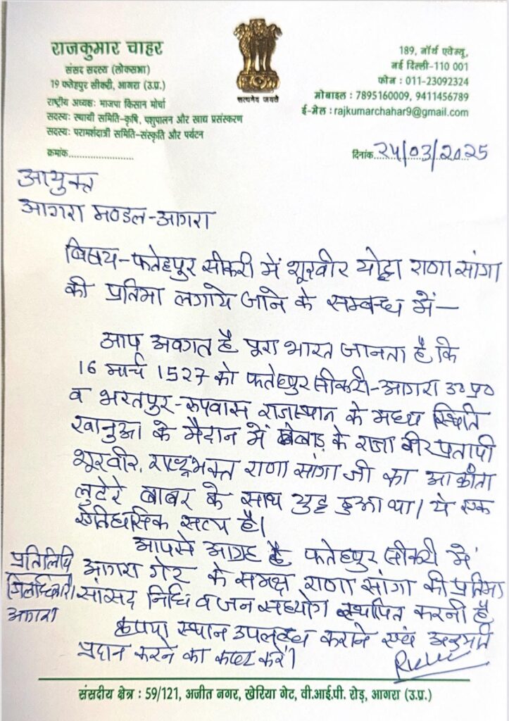सांसद चाहर ने अपने पत्र में 16 मार्च 1527 के ऐतिहासिक खानवा युद्ध का उल्लेख किया, जो मेवाड़ के राणा सांगा और मुगल शासक बाबर के बीच लड़ा गया था। यह युद्ध केवल एक सैन्य संघर्ष नहीं, बल्कि भारत की स्वतंत्रता और स्वाभिमान की रक्षा का प्रतीक था।