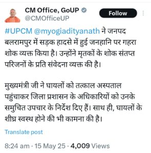 यूपी के सीएम योगी आदित्यनाथ ने जनपद बलरामपुर में हुए सड़क हादसे में हुई जनहानि पर गहरा शोक व्यक्त किया है। मुख्यमंत्री ने दुर्घटना में मारे गए लोगों के परिजनों के प्रति संवेदना प्रकट की है। उन्होंने जिला प्रशासन को निर्देशित किया है कि घायलों का समुचित उपचार सुनिश्चित किया जाए। मुख्यमंत्री ने घायलों के शीघ्र स्वस्थ होने की कामना भी की है।
