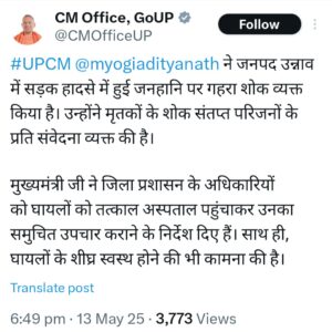 सीएम योगी आदित्यनाथ ने इस हृदयविदारक हादसे पर गहरा दुख व्यक्त किया है। उन्होंने मृतकों के परिजनों के प्रति संवेदना प्रकट की और ईश्वर से दिवंगत आत्माओं की शांति की प्रार्थना की है।
