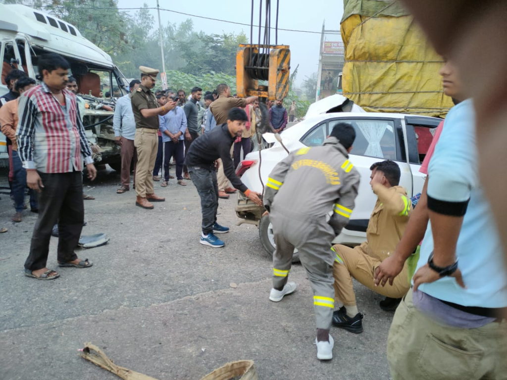 यूपी के अयोध्या-लखनऊ हाईवे पर शुक्रवार तड़के हुए एक हादसे में तीन लोगों की जान चली गई। ट्रक में ट्रैवलर व कार के टकराने से 15 लोग घायल हो गए। उनमें दो की हालत गंभीर है। घायलों को जिला अस्पताल भेजा गया है।