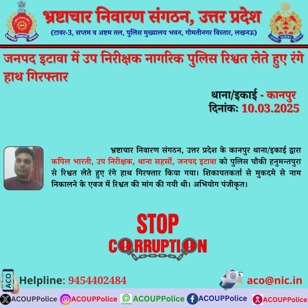 उत्तर प्रदेश के इटावा जिले में एंटी करप्शन कानपुर की टीम ने सोमवार को बड़ी कार्रवाई करते हुए थाना सहसों के हनुमंतपुरा चौकी के दरोगा कपिल भारती को 50 हजार रुपये की रिश्वत लेते हुए रंगे हाथों गिरफ्तार किया है। इस कार्रवाई के बाद आरोपी दरोगा को टीम थाने ले गई जहां उसके खिलाफ भ्रष्टाचार के मामले में कार्रवाई की गई। एंटी करप्शन की इस कार्रवाई के बाद पुलिस महकमे में हड़कंप मच गया।