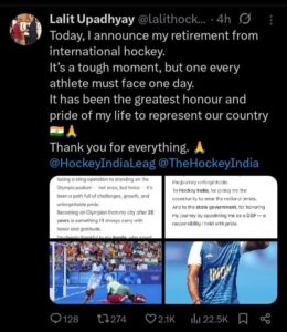 भारतीय हॉकी के दिग्गज खिलाड़ी और दो बार के ओलंपियन ललित उपाध्याय ने अंतरराष्ट्रीय हॉकी से संन्यास की घोषणा कर दी है। वाराणसी के इस गौरवशाली खिलाड़ी ने सोशल मीडिया प्लेटफॉर्म ‘X’ (पूर्व में ट्विटर) पर एक भावुक पोस्ट के जरिए अपने निर्णय की जानकारी दी, जिससे उनके प्रशंसक और पूरा खेल जगत भावुक हो उठा।