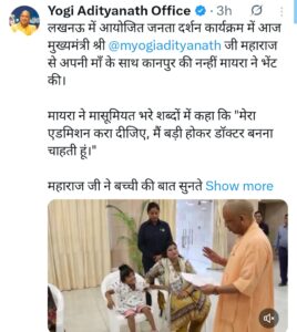 जनता दर्शन में कानपुर से अपनी मां के साथ आई नन्ही मायरा ने मुख्यमंत्री से मुलाकात की। मायरा ने सीएम से कहा, “मेरा एडमिशन करा दीजिए, मैं बड़ी होकर डॉक्टर बनना चाहती हूं।” मायरा की बात सुनकर सीएम योगी भावुक हो गए और उन्होंने अधिकारियों को तत्काल उसका एडमिशन कराने के निर्देश दिए। सीएम ने मायरा को आश्वासन दिया कि उसका डॉक्टर बनने का सपना जरूर पूरा होगा।