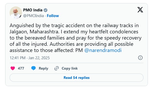 प्रधानमंत्री कार्यालय ने कहा, “महाराष्ट्र के जलगांव में रेलवे ट्रैक पर हुए दुखद हादसे से दुखी हूं। मैं शोक संतप्त परिवारों के प्रति अपनी हार्दिक संवेदना व्यक्त करता हूं और सभी घायलों के शीघ्र स्वस्थ होने की प्रार्थना करता हूं। अधिकारी प्रभावित लोगों को हर संभव सहायता प्रदान कर रहे हैं।”