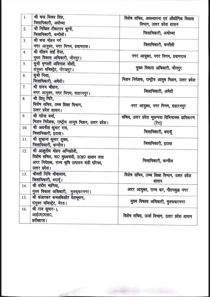 उत्तर प्रदेश सरकार ने प्रशासनिक ढांचे में बड़ा फेरबदल करते हुए 16 आईएएस अधिकारियों का तबादला कर दिया है। इनमें अयोध्या, अमेठी, चंदौली, इटावा, बदायूं और कन्नौज समेत छह जिलों के डीएम बदले गए हैं। इस फेरबदल में कई अधिकारियों को नई जिम्मेदारियां दी गई हैं।
