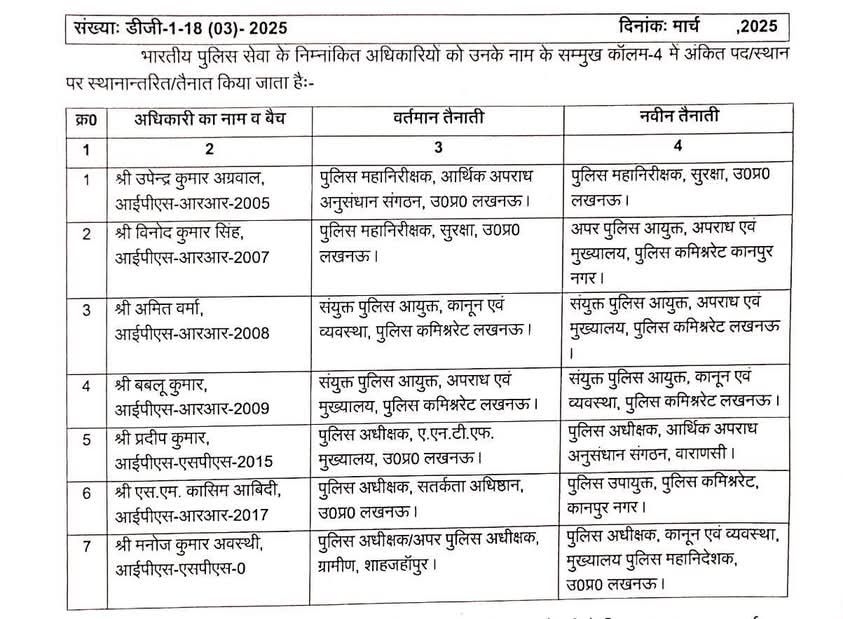 -बबलू कुमार: संयुक्त पुलिस आयुक्त, अपराध एवं मुख्यालय, लखनऊ से संयुक्त पुलिस आयुक्त, कानून एवं व्यवस्था, लखनऊ।