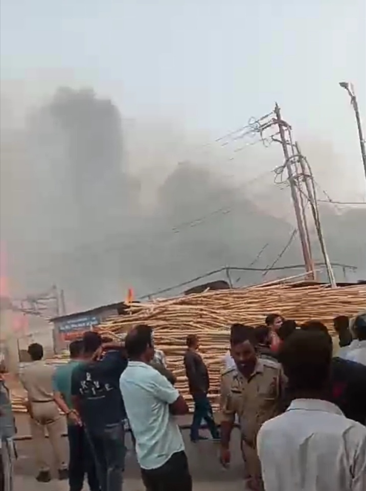 महाकुंभ क्षेत्र के परेड ग्राउंड में लालू जी एंड सन्स टेंट हाउस के गोदाम में भीषण आग