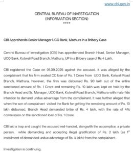 यूपी के मथुरा में कोतवाली रोड स्थित यूको बैंक की सीनियर मैनेजर गरिमा सिंह और उसके कथित दलाल आरिफ मोहम्मद को सीबीआई ने रिश्वत लेते हुए रंगे हाथ गिरफ्तार किया। आरोप है कि उन्होंने एक करोड़ रुपये के स्वीकृत ऋण की अंतिम किस्त जारी करने के बदले चार लाख रुपये रिश्वत की मांग की थी।