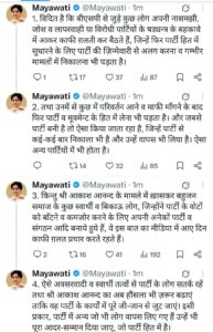 मायावती ने एक्स (पूर्व में ट्विटर) पर मंगलवार को चार पोस्ट करते हुए कहा कि कुछ लोग नासमझी, जोश या विरोधी दलों के षड्यंत्र के चलते गलतियां कर बैठते हैं, जिनके चलते उन्हें पार्टी से बाहर करना पड़ता है। हालांकि समय के साथ जब वे गलती स्वीकार कर सुधार की दिशा में बढ़ते हैं, तो पार्टी हित में उन्हें फिर से शामिल भी किया जाता है। उन्होंने कहा कि यह परंपरा केवल बसपा में ही नहीं, बल्कि अन्य दलों में भी है।