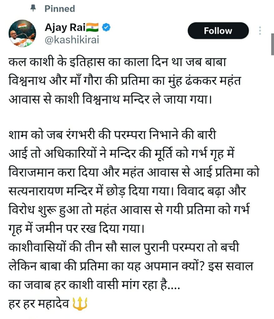 अजय राय ने अपने एक्स अकाउंट पर कहा है कि कल काशी के इतिहास का काला दिन था जब बाबा विश्वनाथ और माँ गौरा की प्रतिमा का मुंह ढंककर महंत आवास से काशी विश्वनाथ मन्दिर ले जाया गया। शाम को जब रंगभरी की परम्परा निभाने की बारी आई तो अधिकारियों ने मन्दिर की मूर्ति को गर्भ गृह में विराजमान करा दिया और महंत आवास से आई प्रतिमा को सत्यनारायण मन्दिर में छोड़ दिया गया। विवाद बढ़ा और विरोध शुरू हुआ तो महंत आवास से गयी प्रतिमा को गर्भ गृह में जमीन पर रख दिया गया। काशीवासियों की तीन सौ साल पुरानी परम्परा तो बची लेकिन बाबा की प्रतिमा का यह अपमान क्यों? इस सवाल का जवाब हर काशी वासी मांग रहा
