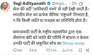 सीएम योगी ने कहा, “सेना की वर्दी ‘जातिवादी चश्मे’ से नहीं देखी जाती है। भारतीय सेना का प्रत्येक सैनिक ‘राष्ट्रधर्म’ निभाता है, न कि किसी जाति या मजहब का प्रतिनिधि होता है।” उन्होंने कहा कि रामगोपाल यादव द्वारा एक वीरांगना को जाति के दायरे में बांधना न केवल समाजवादी पार्टी की मानसिकता को दर्शाता है, बल्कि यह सेना के शौर्य और देश की गरिमा का अपमान भी है।