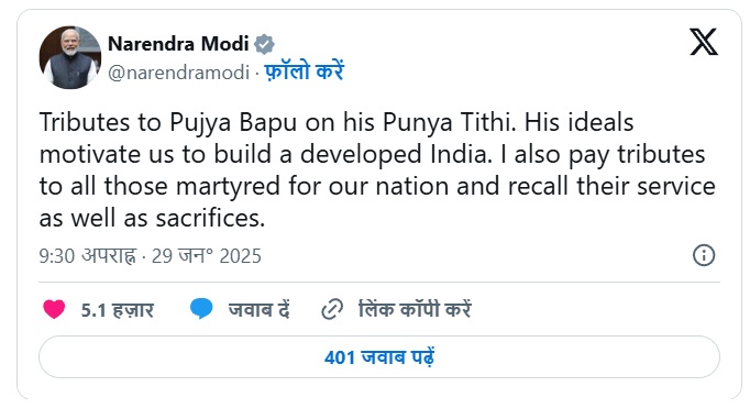 मोदी ने एक्स पर लिखा, ‘‘पूज्य बापू को उनकी पुण्यतिथि पर श्रद्धांजलि। उनके आदर्श हमें विकसित भारत के निर्माण के लिए प्रेरित करते हैं। मैं हमारे राष्ट्र के लिए शहीद हुए सभी लोगों को भी श्रद्धांजलि देता हूं और उनकी सेवा एवं बलिदान को याद करता हूं। राष्ट्रपिता गांधी की 1948 में आज ही के दिन नाथूराम गोडसे ने गोली मारकर हत्या कर दी थी।