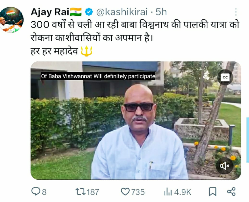 पुलिस की इस नोटिस पर कांग्रेस के प्रदेश अध्यक्ष अजय राय ने अपने एक्स अकाउंट पर एक वीडियो पोस्ट कर रंगभरी एकादशी की पालकी और कार्यक्रम में शामिल होने की बात कही है। उन्होंने इसे तीन सौ साल पुरानी परम्परा बताते हुए पीएम से इसे बहाल करने की मांग की। वहीं ये भी कहा कि इससे पहले ये परम्परा कभी नहीं टूटी है। ये काशी वासियों का अपमान है। हम सब लोग पालकी पूजन में रहेंगे और काशी वासियों के सम्मान के लिए डटकर लड़ेंगे।
