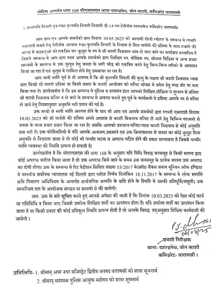 यूपी के वाराणसी में रंगभरी एकादशी के लिए सोमवार को प्रस्तावित टेढ़ीनीम स्थित महंत आवास से काशी विश्वनाथ धाम तक निकलने वाली पालकी यात्रा को लेकर पुलिस ने आयोजक को नोटिस थमा दी है। पुलिस ने इसे बिना अनुमति आयोजन करार देते हुए यात्रा निकलने पर कार्रवाई की बात कही है। वहीं प्रदेश कांग्रेस अध्यक्ष अजय राय ने इसे परंपरा तोड़ने वाली कार्रवाई बताकर निंदा कर पीएम से इसे बहाल किये जाने की मांग रखी और स्वयं आयोजन में मौजूद रहने की बात कही। इस नोटिस को लेकर सपा नेता व मंदिर के महंत ने भी विरोध जताया है।