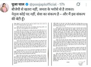 इसके बाद पूजा पाल ने अपने एक्स हैंडल से एक पत्र जारी किया है। इस पत्र में उन्होंने कहा कि आपने जो कहा है कि भाजपा मुझे मंत्री बनाये तो मुझे मन्त्री बनने की चाहत नहीं है, बल्कि अपने पति के हत्यारों को सजा दिलाना उद्देश्य था। सीएम योगी ने मुझे न्याय दिया और मेरे पति के हत्यारों को मिट्टी में मिला दिया और मेरे जीवन का मकसद पूरा हुआ, किन्तु आप मुख्यमंत्री बनने के लिये आज भी अपराधियों को संरक्षण दे करके जो पाप कर रहे हैं, जिनको दूध पिला रहे हो, आने वाली पीढ़ियां कभी आपको माफ नहीं करेगीं।