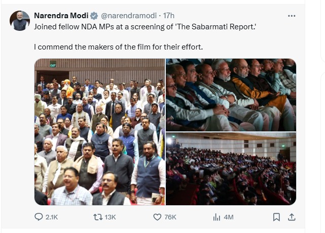 प्रधानमंत्री नरेंद्र मोदी ने अपने सहयोगी एनडीए सांसदों के साथ फिल्म ‘द साबरमती रिपोर्ट’ का विशेष प्रदर्शन देखा और इसके निर्माताओं के प्रयास की सराहना की। प्रधानमंत्री ने सोशल मीडिया प्लेटफॉर्म एक्स (पूर्व में twitter ) पर फिल्म की तारीफ करते हुए लिखा, “मैं ‘द साबरमती रिपोर्ट’ फिल्म के निर्माताओं की सराहना करता हूं और इस प्रयास के लिए उन्हें बधाई देता हूं।”