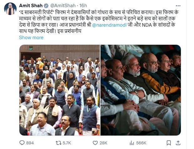 इस मौके पर गृह मंत्री अमित शाह ने भी फिल्म की जमकर प्रशंसा की। उन्होंने सोशल मीडिया प्लेटफॉर्म एक्स पर लिखा, “इस फिल्म ने देशवासियों को गोधरा कांड के असल सच से परिचित कराया और बताया कि कैसे एक पूरा इकोसिस्टम इसे छिपाने में लगा था। आज प्रधानमंत्री नरेंद्र मोदी जी और एनडीए सांसदों के साथ इस फिल्म का आयोजन किया गया है, और मैं पूरी फिल्म टीम को इस प्रशंसनीय प्रयास के लिए बधाई देता हूं।” शाह ने फिल्म के निर्माताओं और निर्देशक को इस ऐतिहासिक घटना पर आधारित सटीक चित्रण के लिए धन्यवाद दिया।