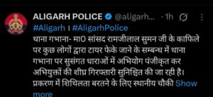 यूपी के अलीगढ़ जिले में बुलंदशहर जा रहे सांसद रामजीलाल सुमन के काफिले पर करणी सेना ने टायर फेंके फिर काले झंडे दिखाए। अफरातफरी के बीच कई वाहन एक दूसरे से टकराकर क्षतिग्रस्त हो गए। घटना को लेकर गुस्साए सपाइयों व सांसद को पुलिस ने वापस जाने को कहा तो देर तक नोकझोक हुई। आखिरकार सांसद को वापस जाना पड़ा। इस मामले में अलीगढ़ के एसपी सिटी मृगांक शेखर ने चौकी प्रभारी को सस्पेंड करने व एसओ के खिलाफ जांच की बात कही है। वहीं सपा मुखिया ने एक बार फिर सांसद के साथ हुई इस घटना को लेकर सरकार पर सवाल दागे हैं।