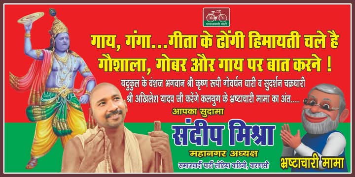 सपा के नेता संदीप मिश्रा ने एक विवादित पोस्टर लगवाया, जिसमें गाय, गंगा और गीता के नाम पर ढोंग करने का आरोप लगाते हुए पीएम मोदी को “भ्रष्टाचारी मामा” करार दिया गया। इस पोस्टर में सपा प्रमुख अखिलेश यादव को भगवान कृष्ण के रूप में प्रस्तुत किया गया, जबकि स्वयं संदीप मिश्रा ने अपने आप को सुदामा के अवतार में दिखाया।