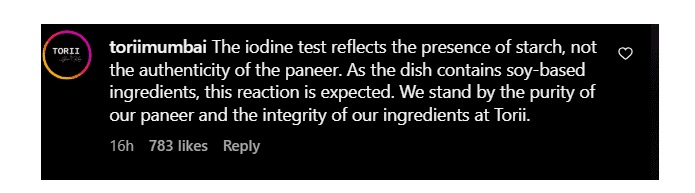 टोरी के प्रबंधन ने सार्थक की पोस्ट के कमेंट सेक्शन में तुरंत जवाब दिया। स्थिति को स्पष्ट करते हुए उन्होंने लिखा, “आयोडीन परीक्षण स्टार्च की उपस्थिति को दर्शाता है, न कि यह कि पनीर असली है या नकली। चूंकि डिश में सोया-आधारित तत्व हैं, इसलिए यह परिणाम आना तय था। हम अपने पनीर की शुद्धता और टोरी की अखंडता के साथ खड़े हैं।”