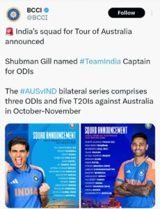 भारतीय क्रिकेट कंट्रोल बोर्ड (BCCI) की सीनियर चयन समिति ने ऑस्ट्रेलिया दौरे के लिए वनडे और टी20 टीमों का एलान कर दिया है। इस दौरे में भारत तीन वनडे और पांच टी20 मुकाबले खेलेगा। टीम में बड़ा बदलाव देखने को मिला है। युवा बल्लेबाज शुभमन गिल को वनडे टीम का कप्तान बनाया गया है, जबकि श्रेयस अय्यर को उप-कप्तान की जिम्मेदारी सौंपी गई है।