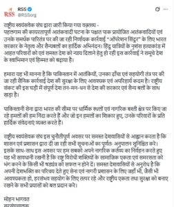 राष्ट्रीय स्वयंसेवक संघ (RSS) ने पहलगाम में हुए कायराना आतंकी हमले के जवाब में भारत सरकार और सैन्य बलों द्वारा चलाए जा रहे ‘ऑपरेशन सिंदूर’ की सराहना की है। संघ ने इसे देश की सुरक्षा के लिए आवश्यक और अपरिहार्य कदम बताया है। सरसंघचालक मोहन भागवत के निर्देश पर सरकार्यवाह दत्तात्रेय होसबाले के नाम से जारी बयान में संघ ने कहा कि पाक प्रायोजित आतंकवादियों और उनके तंत्र पर हो रही निर्णायक कार्रवाई ने देश के स्वाभिमान और हिम्मत को नई ऊर्जा दी है।