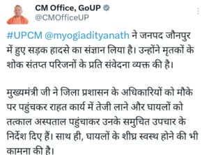 यूपी के जौनपुर जिले में लखनऊ हरदोई हाइवे पर बक्सा थाना क्षेत्र में शुक्रवार की सुबह एक निजी बस बेकाबू होकर डिवाइडर से टकराने के बाद पलट गई। कई पलथे खाने से इस पर सवार पांच यात्रियों ने दम तोड़ दिया। वहीं लगभग 30 यात्री घायल हुए हैं। सीएम में इस हादसे में हुई जनहानि पर शोक जताते हुए घायलों के समुचित इलाज के निर्देश दिये हैं।
