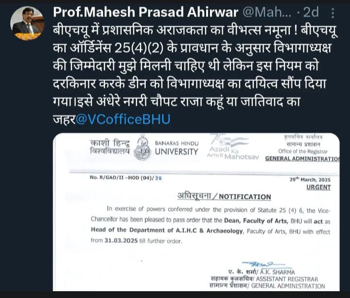 बनारस हिंदू विश्वविद्यालय (बीएचयू) में प्रशासनिक अराजकता का नया मामला सामने आया है। 31 मार्च को प्रो. सुमन जैन का विभागाध्यक्ष कार्यकाल समाप्त होने के बाद, नियम और वरिष्ठता के आधार पर प्रो. एमपी अहिरवार को विभागाध्यक्ष बनाया जाना था। हालांकि, प्रशासन ने आश्चर्यचकित करते हुए डीन को जिम्मेदारी सौंप दी और प्रो. सुषमा घिल्डियाल को विभाग का प्रभार दिया।
