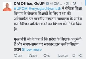 शिक्षक पात्रता परीक्षा (टीईटी) पास करने की अनिवार्यता को लेकर आंदोलित यूपी के परिषदीय विद्यालयों के टीचरों के लिए अच्छी खबर है। इस संबंध में राज्य सरकार ने बड़ा निर्णय है। मुख्यमंत्री योगी आदित्यनाथ ने बेसिक शिक्षा विभाग को इस आदेश को लेकर सुप्रीम कोर्ट में रिवीजन दाखिल करने का निर्देश दिया है।