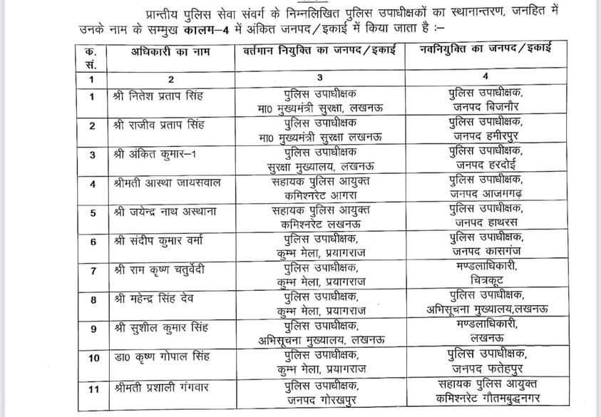 उत्तर प्रदेश मे प्रांतीय पुलिस सेवा (डिप्टी एसपी) के 11 अधिकारियों के तबादले कर दिए हैं। इसके अलावा, छह प्रशिक्षु पुलिस उपाधीक्षकों को नई तैनाती दी गई है।