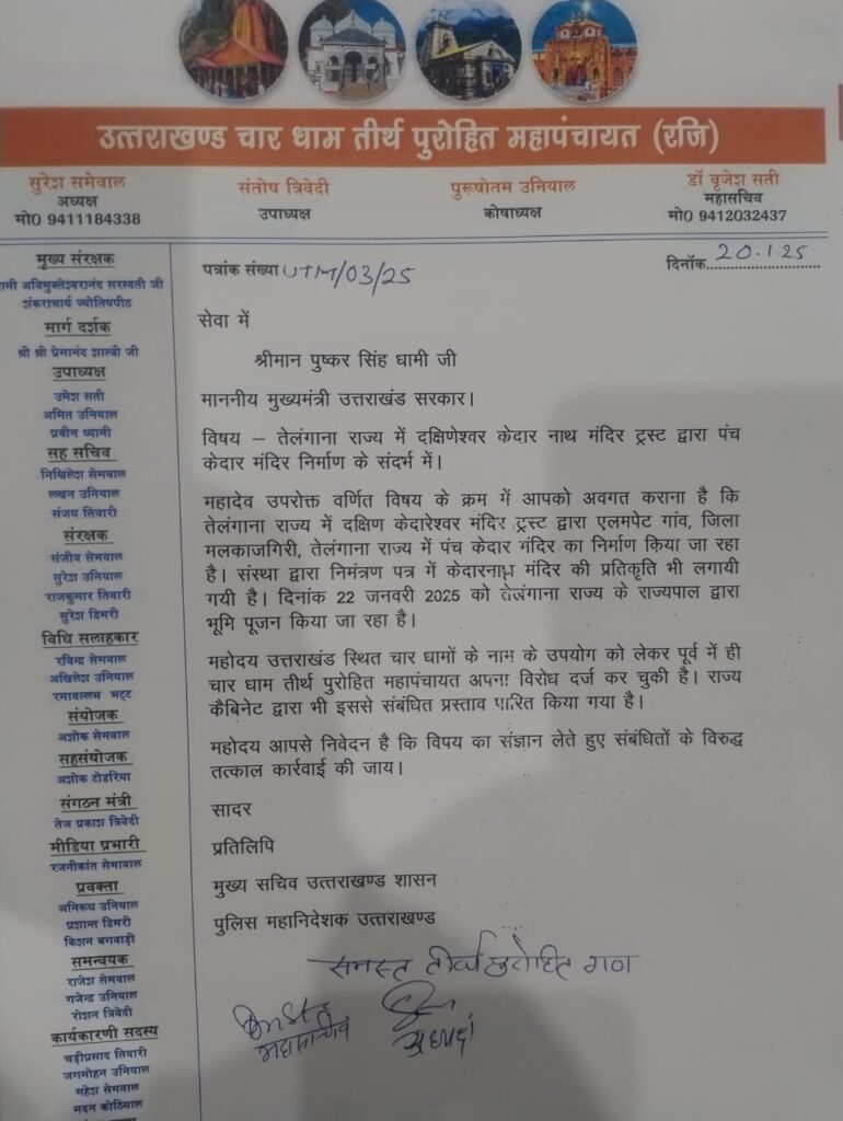 तेलंगाना राज्य में दक्षिण में पंच केदारों के मंदिर निर्माण का उत्तराखंड चार धाम तीर्थ पुरोहित महापंचायत ने कड़ा विरोध किया है। चार धाम महापंचायत में स्पष्ट किया है यदि उत्तराखंड स्थित चार धामों के नाम का दुरुपयोग किया गया तो तीर्थ पुरोहित आंदोलन के लिए बाध्य होंगे।