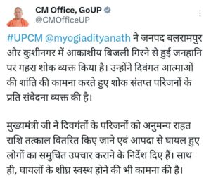 इसी तरह कुशीनगर जिले के कसया थाना क्षेत्र के शामपुर हतवा में खेत में महिला संगीता गुप्ता खेत में काम कर रही थी। आंधी बारिश के बीच बिजली चमकते देख संगीता पेड़ के नीचे खड़ी हो गई। बिजली उसी पेड़ पर गिरी जिसकी चपेट में आने से संगीता झुलस गई और वहीं दम तोड़ बैठी।