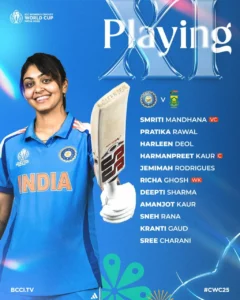 भारत: स्मृति मंधाना, प्रतिका रावल, हरलीन देओल, हरमनप्रीत कौर (कप्तान), जेमिमा रॉड्रिग्ज, ऋचा घोष (विकेटकीपर), दीप्ति शर्मा, स्नेह राणा, अमनजोत कौर, क्रांति गौड़ और श्री चरणी।